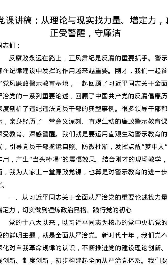 党课讲稿:从理论与现实找力量、增定力,真正受警醒,守廉洁
