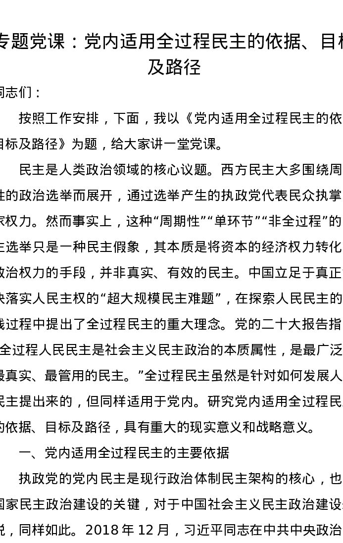 党课讲稿:党内适用全过程民主的依据、目标及路径