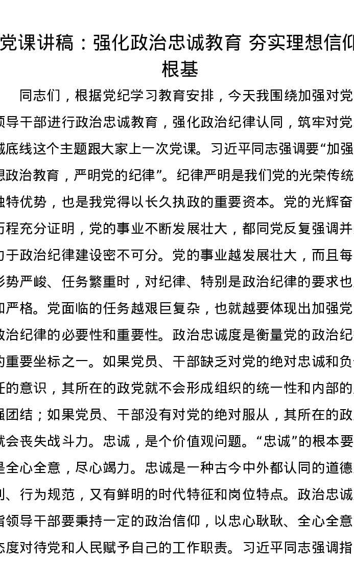 党课讲稿:强化政治忠诚教育夯实理想信仰根基