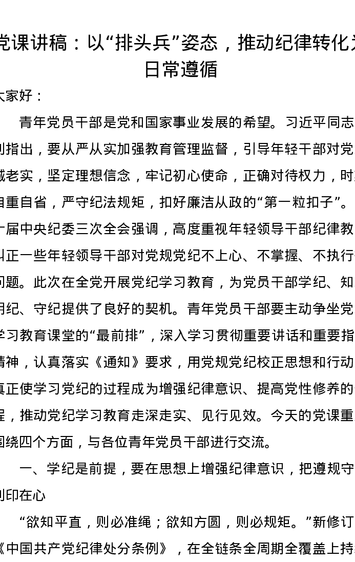 党课讲稿:以“排头兵”姿态,推动纪律转化为日常遵循