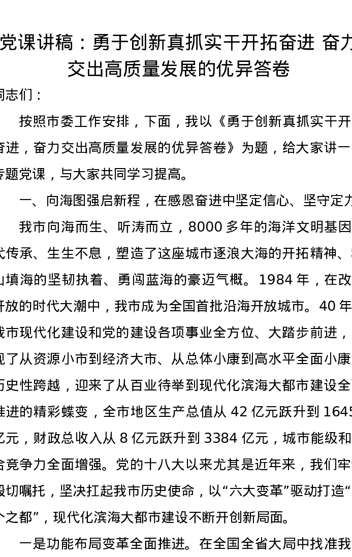 党课讲稿:勇于创新真抓实干开拓奋进奋力交出高质量发展的优异答卷