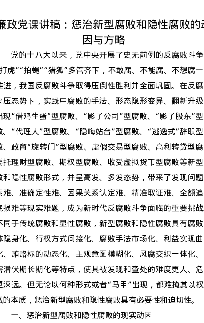廉政党课讲稿:惩治新型腐败和隐性腐败的动因与方略