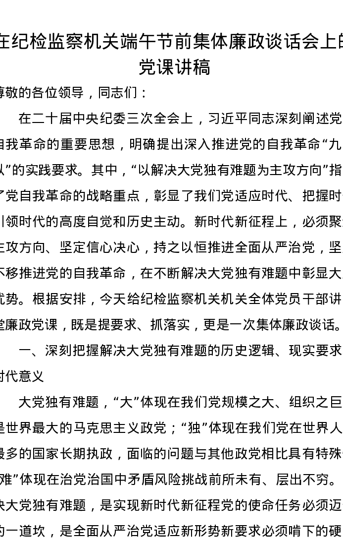 在纪检监察机关端午节前集体廉政谈话会上的党课讲稿