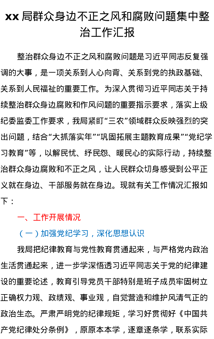 xx局群众身边不正之风和腐败问题集中整治工作汇报