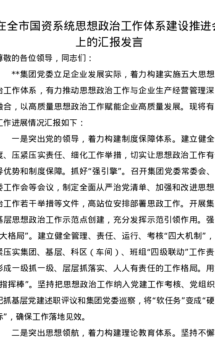 在全市国资系统思想政治工作体系建设推进会上的汇报发言