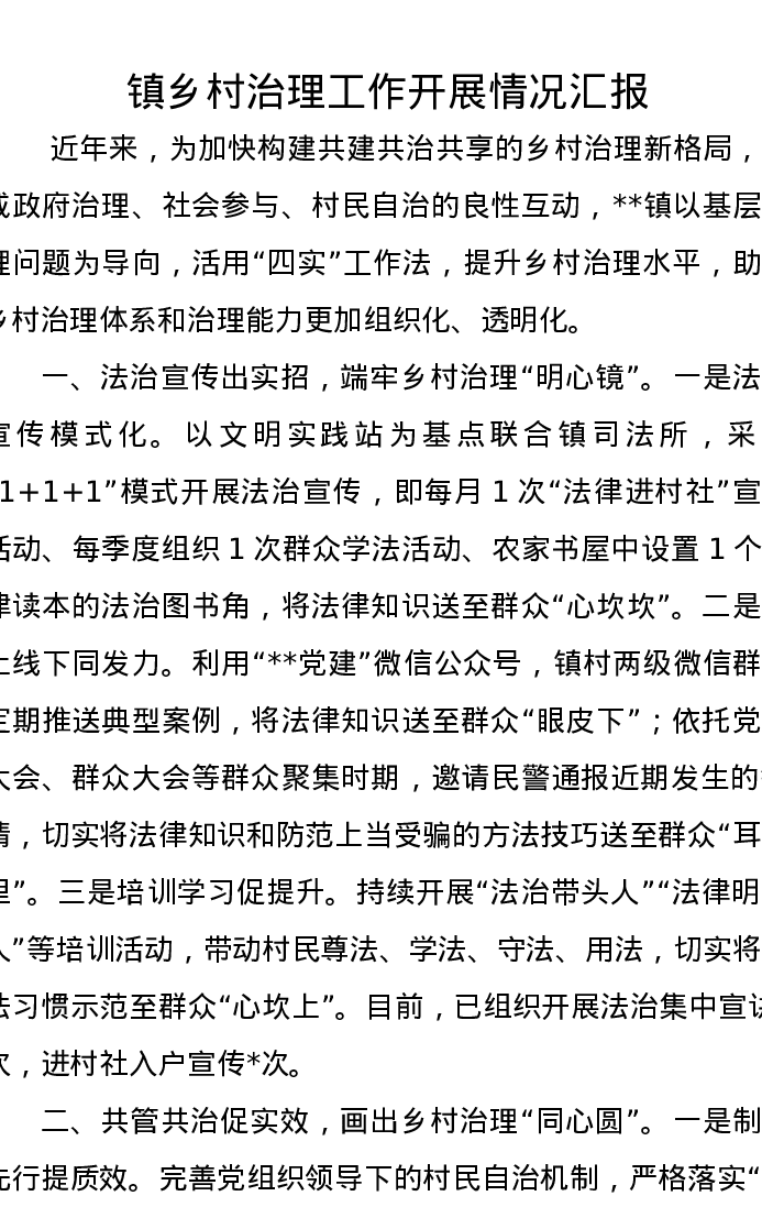 镇乡村治理工作开展情况汇报