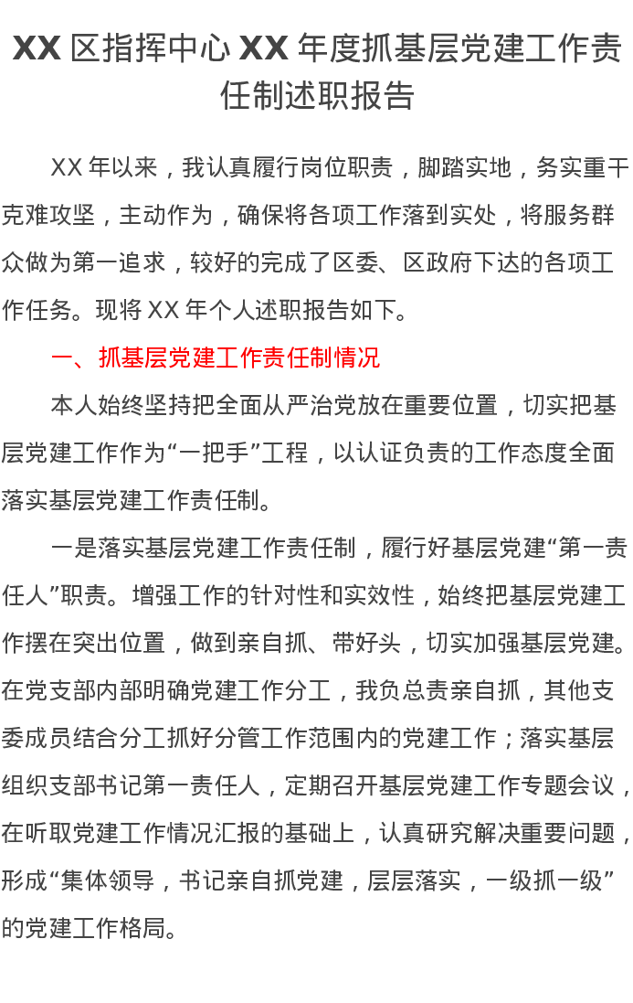 XX区指挥中心XX年度抓基层党建工作责任制述职报告
