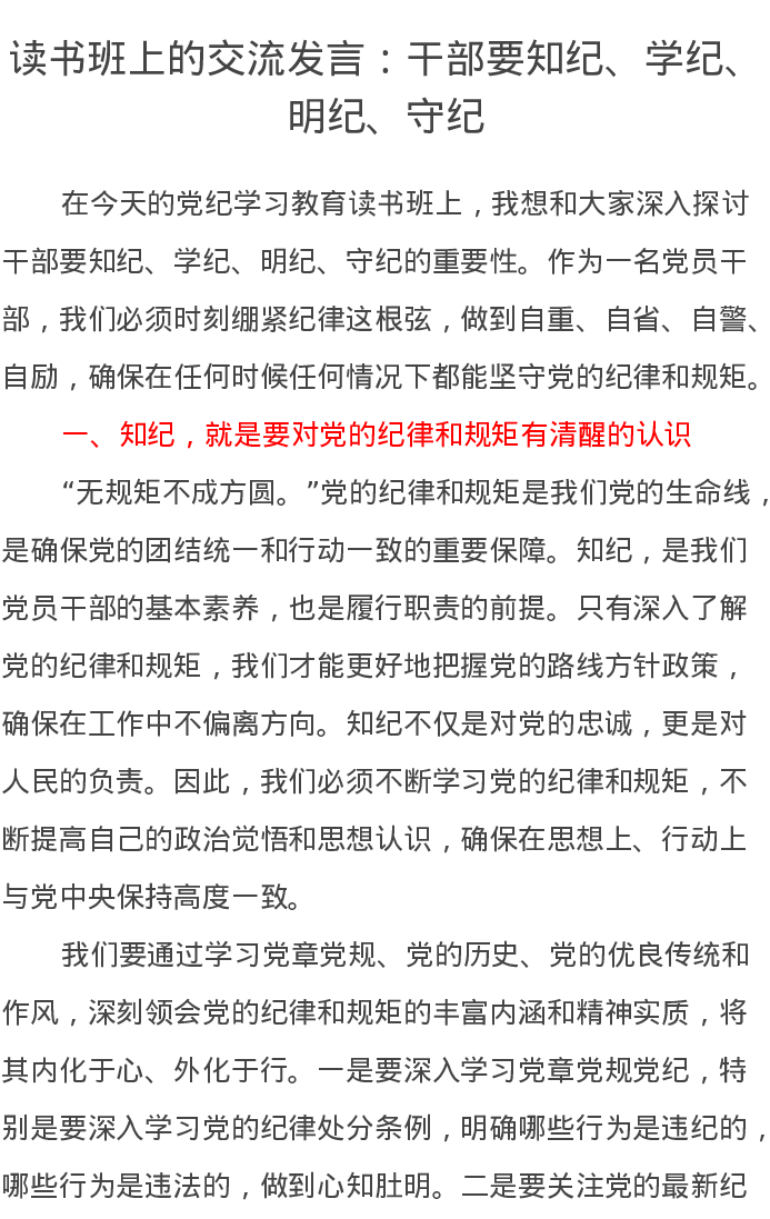 读书班上的交流发言:干部要知纪、学纪、明纪、守纪