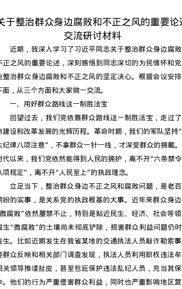 关于整治群众身边腐败和不正之风的重要论述交流研讨发言材料