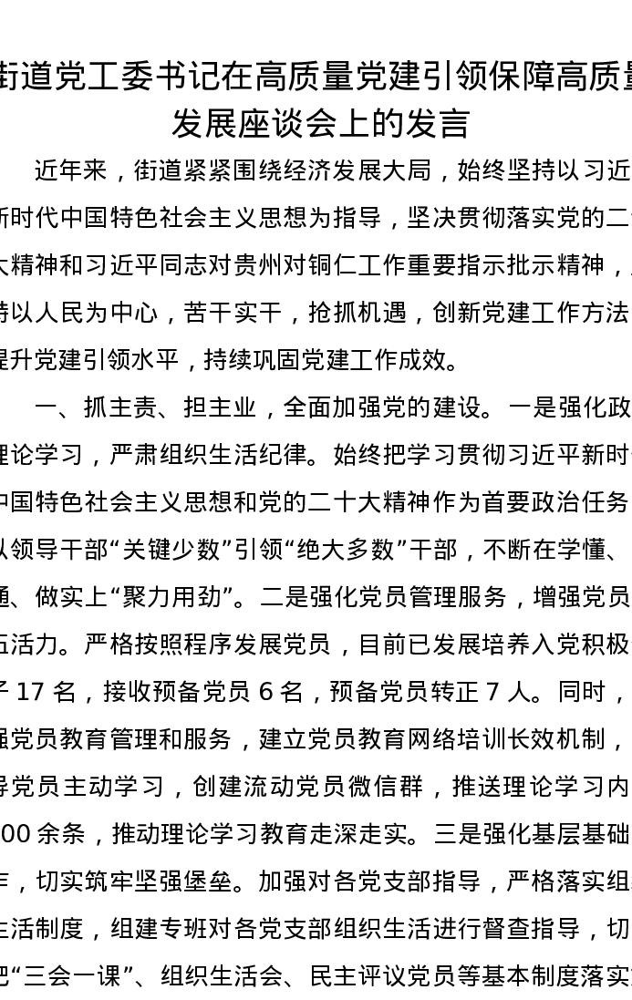 街道党工委书记在高质量党建引领保障高质量发展座谈会上的发言