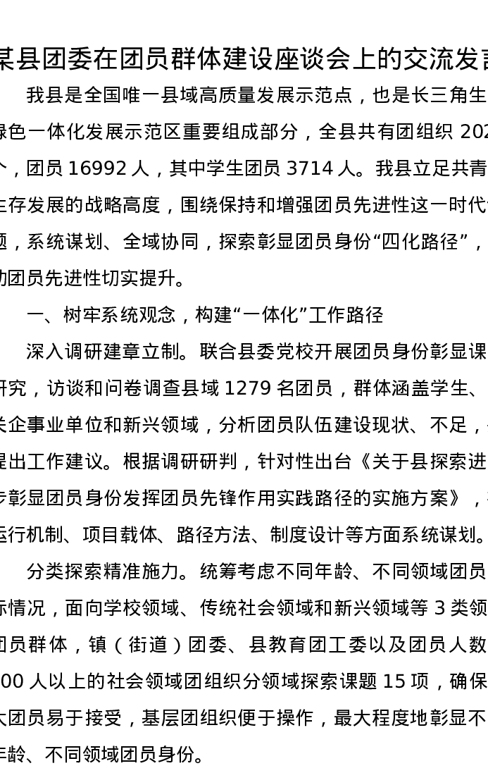 某县团委在团员群体建设座谈会上的交流发言