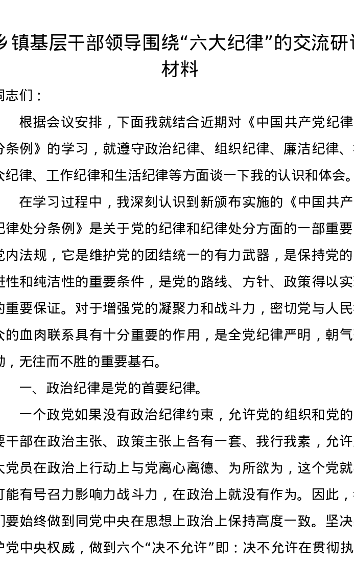 乡镇基层干部领导围绕“六大纪律”的交流研讨材料