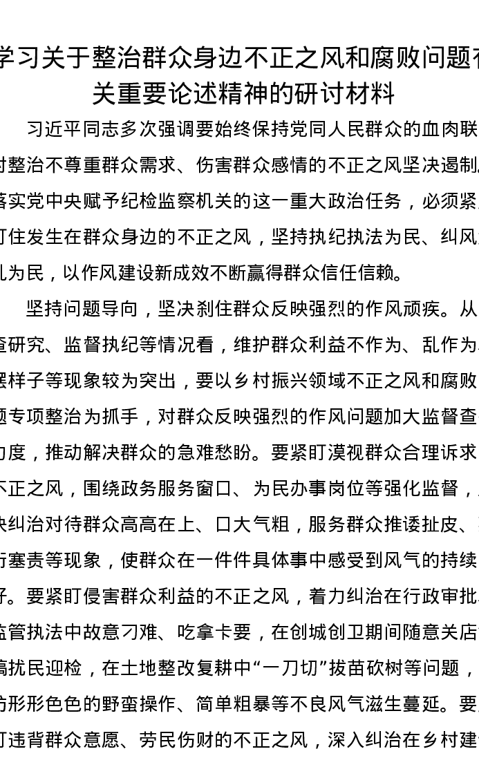 学习关于整治群众身边不正之风和腐败问题有关重要论述精神的研讨发言材料