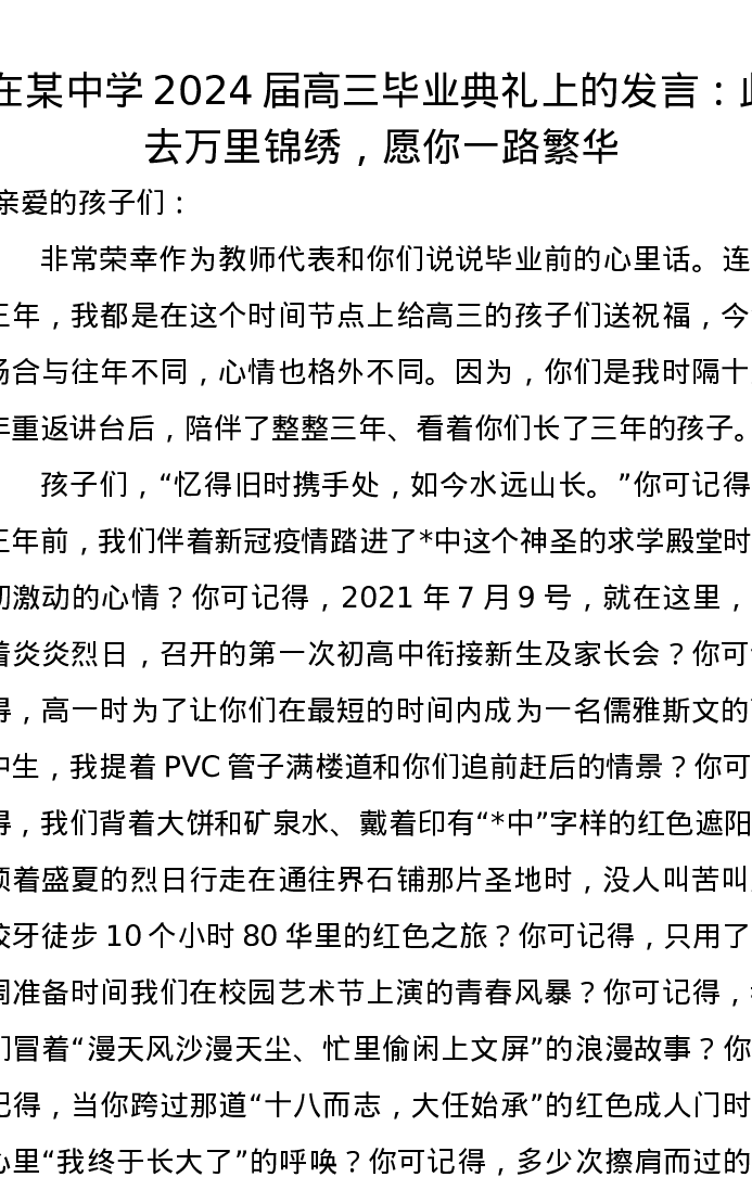 在某中学2024届高三毕业典礼上的发言:此去万里锦绣,愿你一路繁华