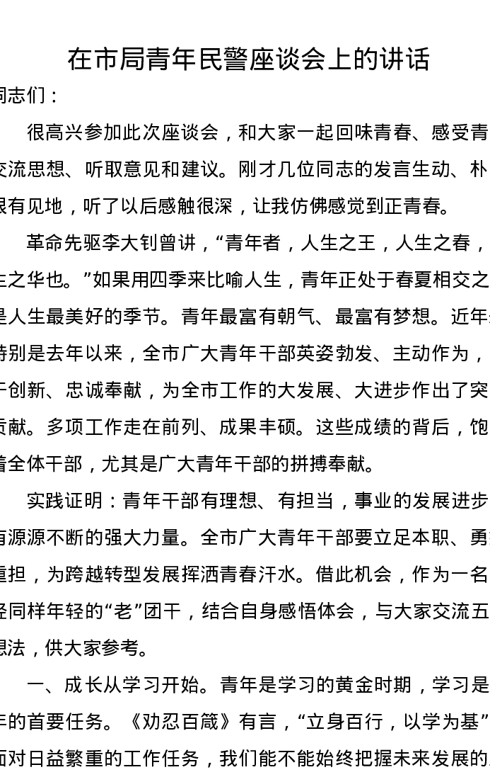 在市局青年民警座谈会上的讲话