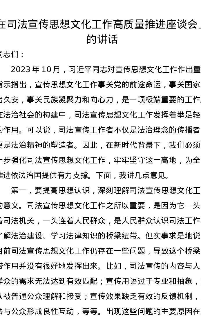 在司法宣传思想文化工作高质量推进座谈会上的讲话