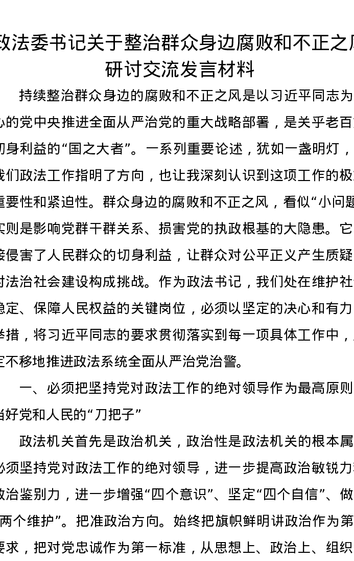 政法委书记关于整治群众身边腐败和不正之风研讨交流发言材料