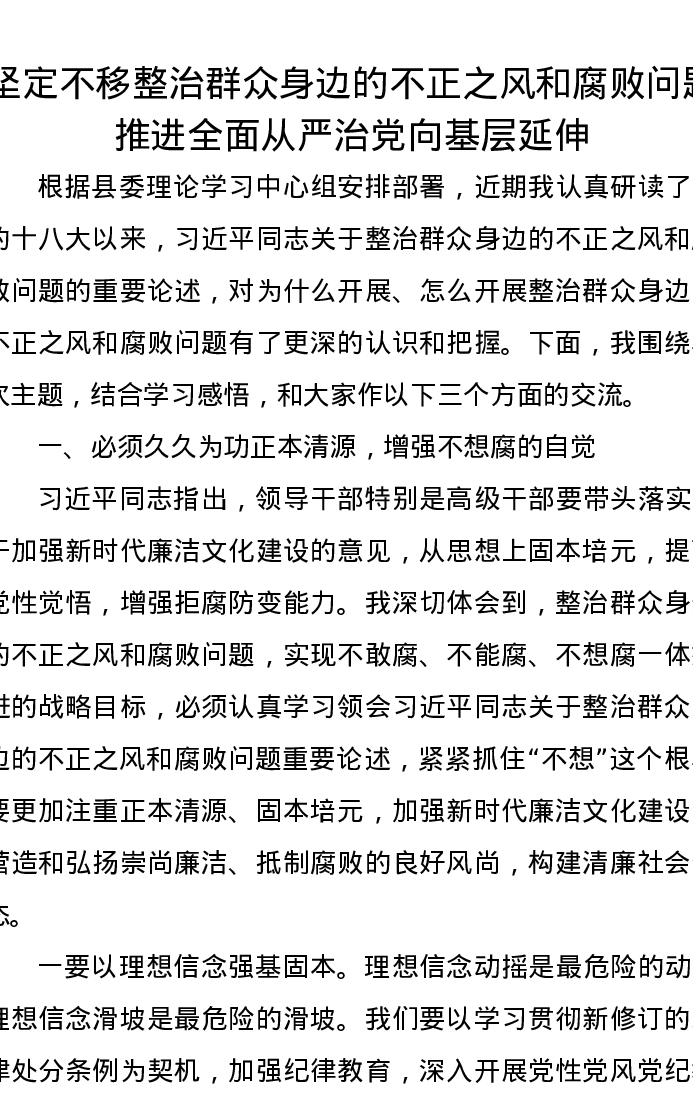 中心组发言:坚定不移整治群众身边的不正之风和腐败问题推进全面从严治党向基层延伸