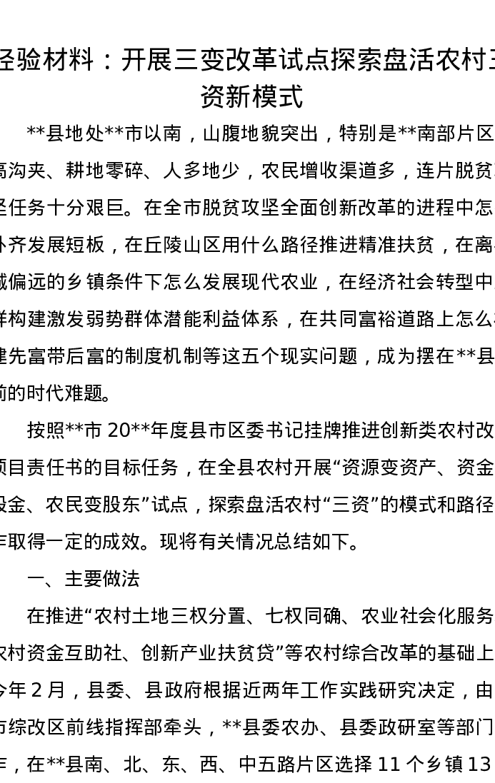 经验材料:开展三变改革试点探索盘活农村三资新模式