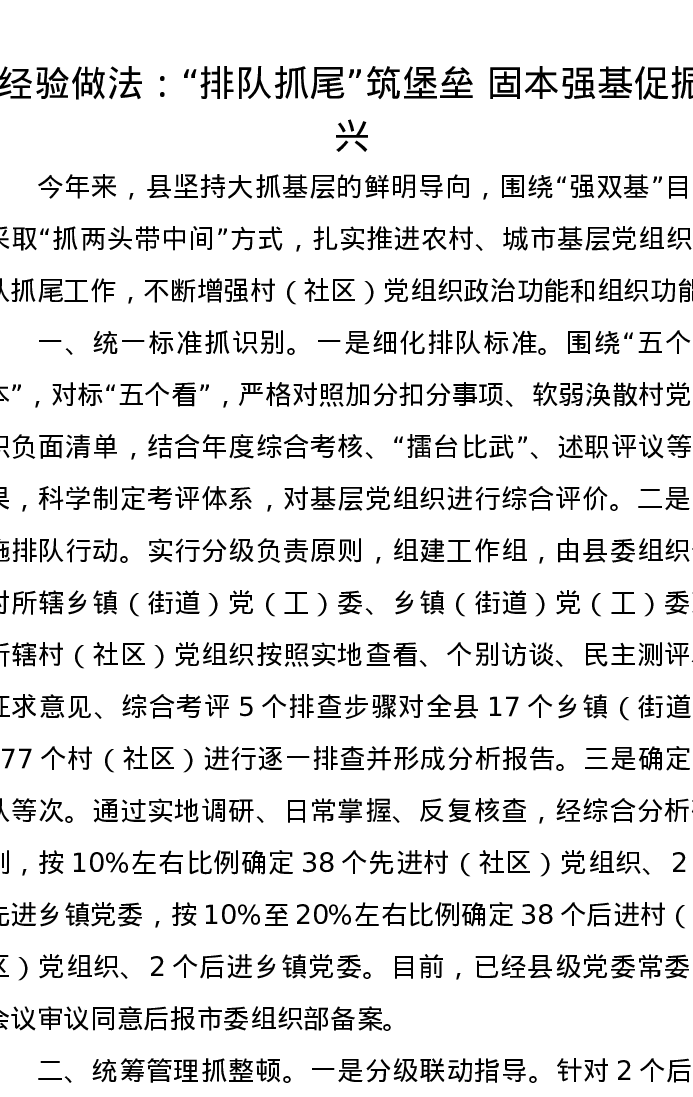 经验做法:“排队抓尾”筑堡垒,固本强基促振兴