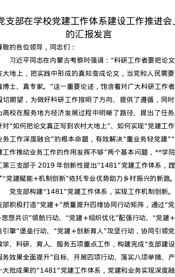 党支部在学校党建工作体系建设工作推进会上的汇报发言