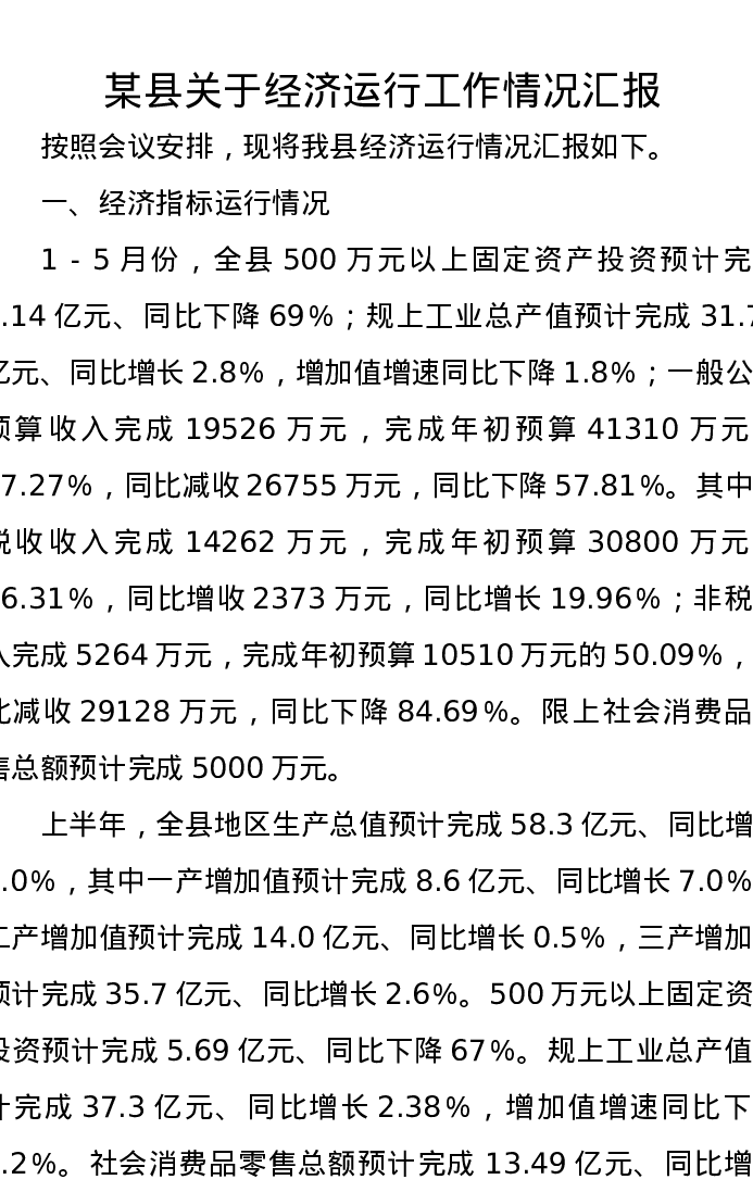 某县关于经济运行工作情况汇报