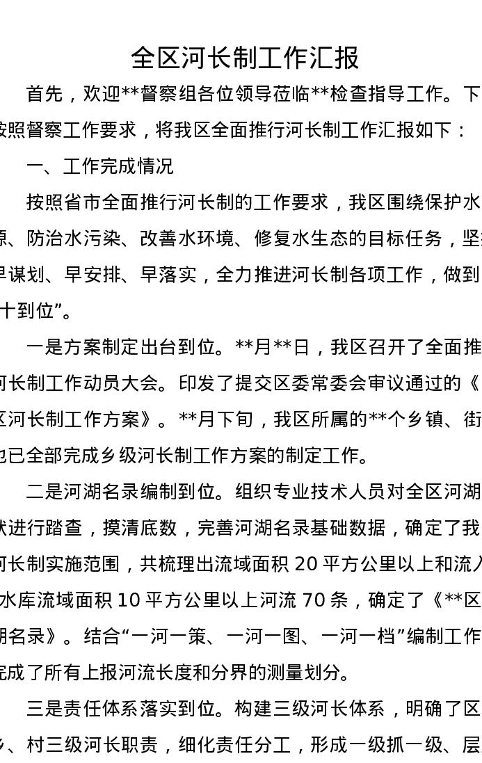 全区河长制工作汇报