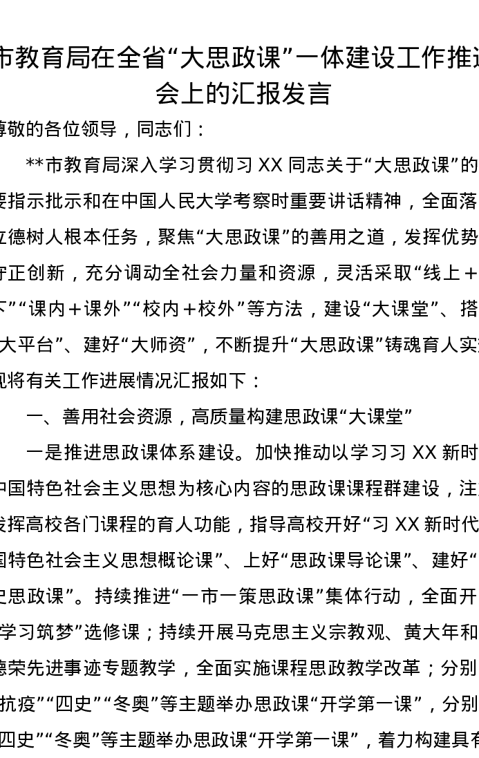 市教育局在全省“大思政课”一体建设工作推进会上的汇报发言