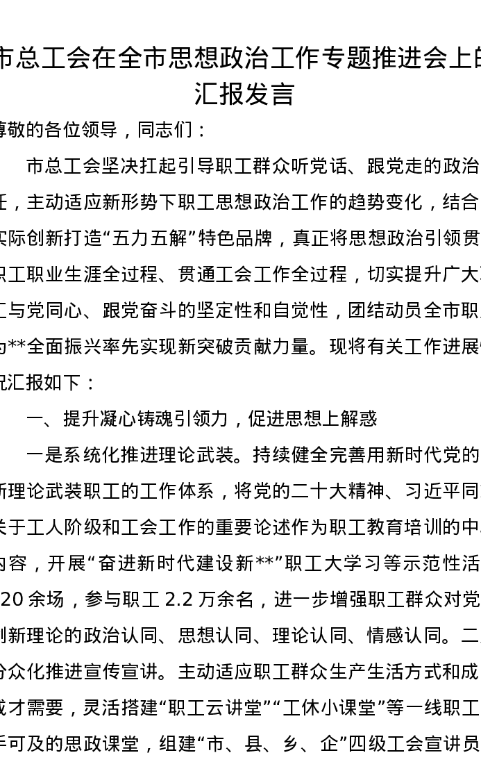 市总工会在全市思想政治工作专题推进会上的汇报发言