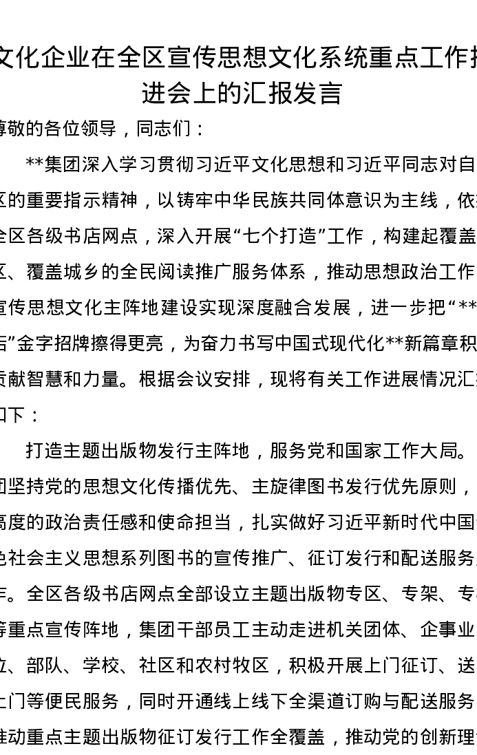 文化企业在全区宣传思想文化系统重点工作推进会上的汇报发言