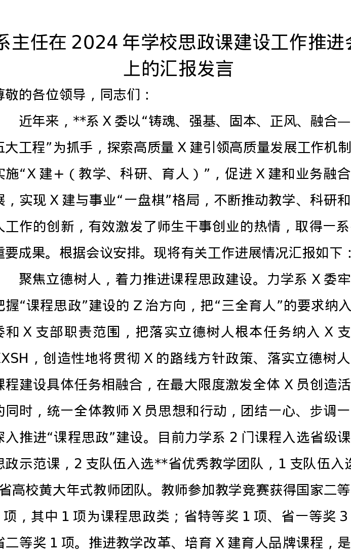 系主任在2024年学校思政课建设工作推进会上的汇报发言