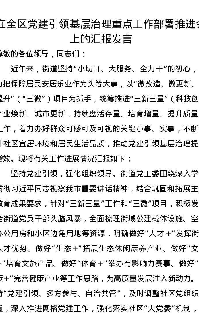 在全区党建引领基层治理重点工作部署推进会上的汇报发言