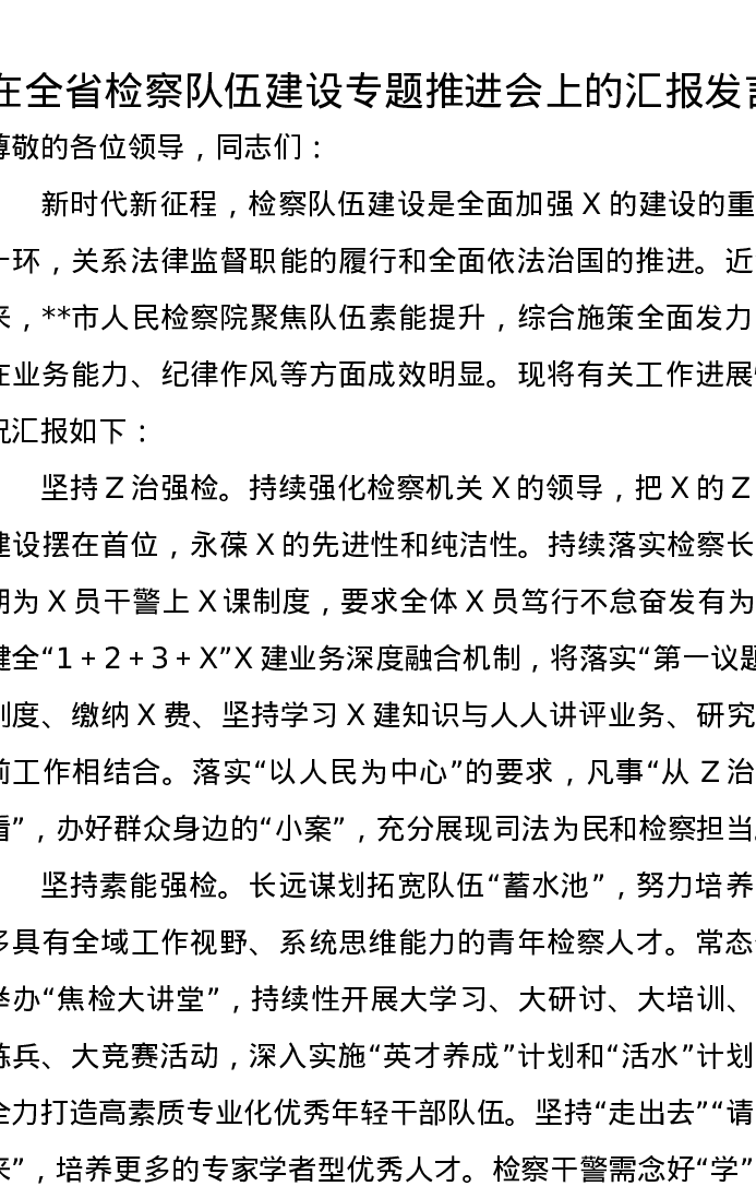 在全省检察队伍建设专题推进会上的汇报发言