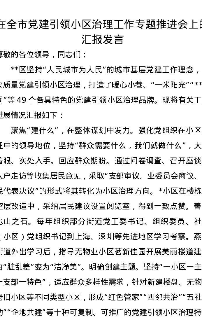 在全市党建引领小区治理工作专题推进会上的汇报发言
