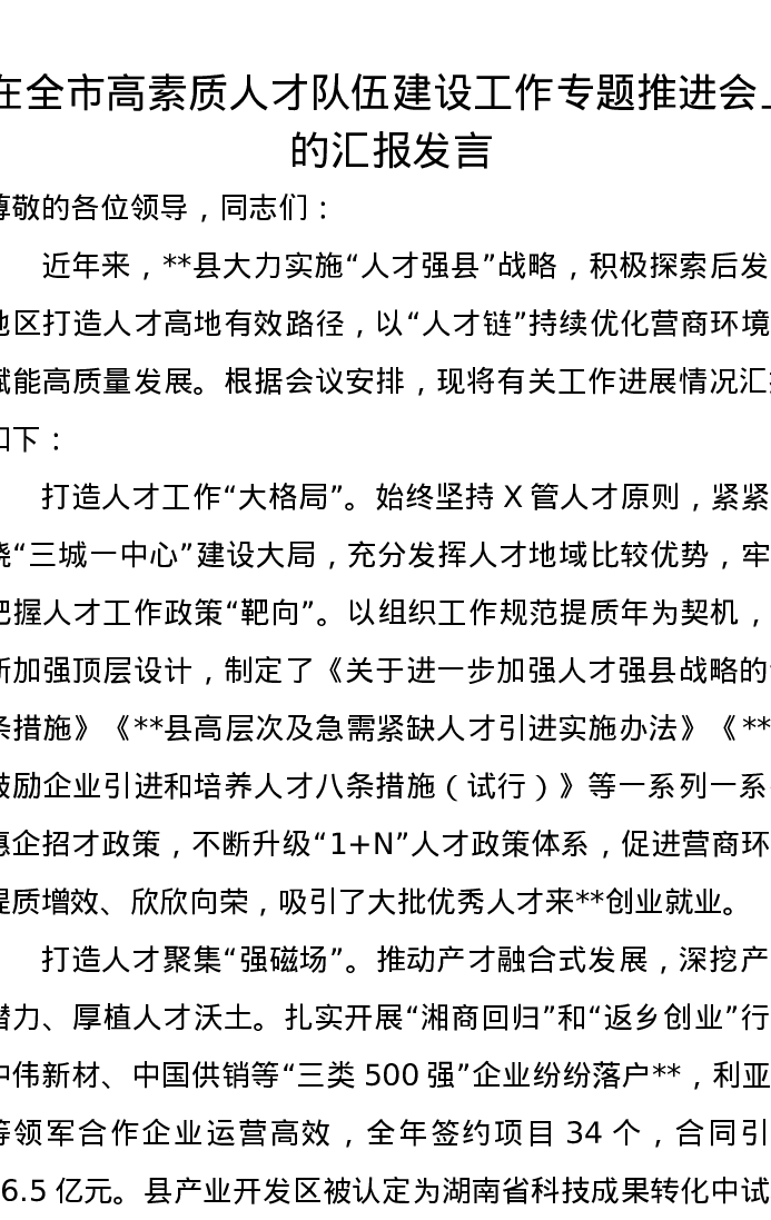 在全市高素质人才队伍建设工作专题推进会上的汇报发言