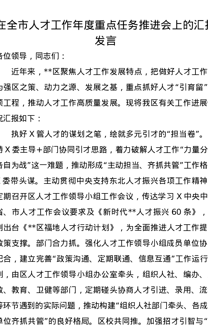 在全市人才工作年度重点任务推进会上的汇报发言