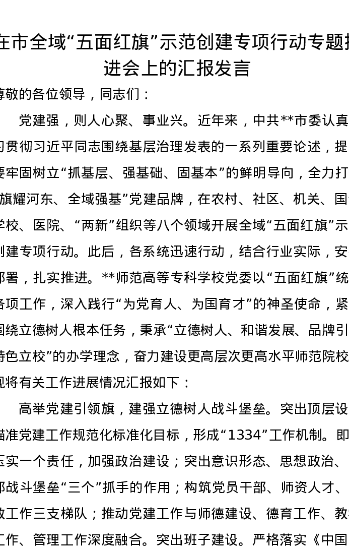 在市全域“五面红旗”示范创建专项行动专题推进会上的汇报发言