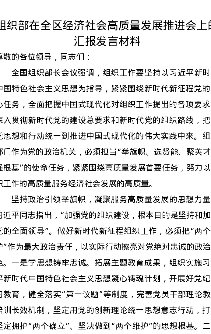 组织部在全区经济社会高质量发展推进会上的汇报发言材料