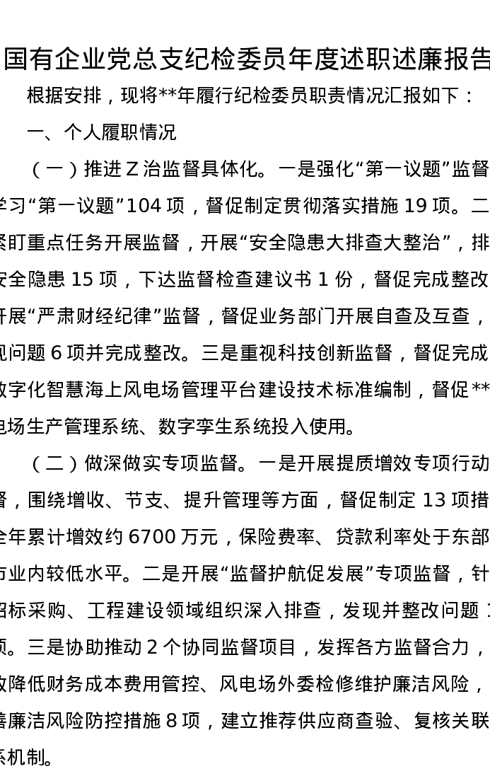 国有企业党总支纪检委员年度述职述廉报告