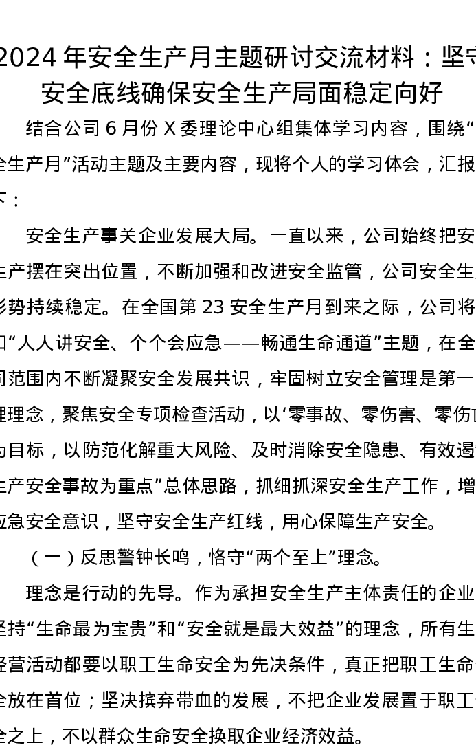 2024年安全生产月主题研讨交流发言材料:坚守安全底线确保安全生产局面稳定向好