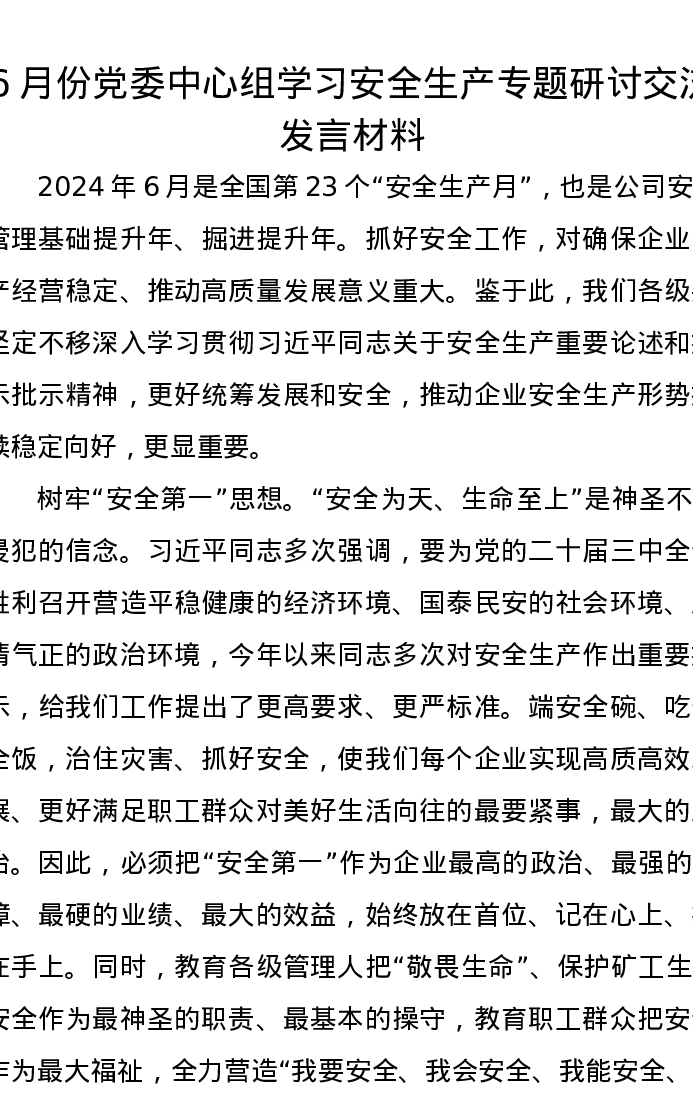 6月份党委中心组学习安全生产专题研讨交流发言材料