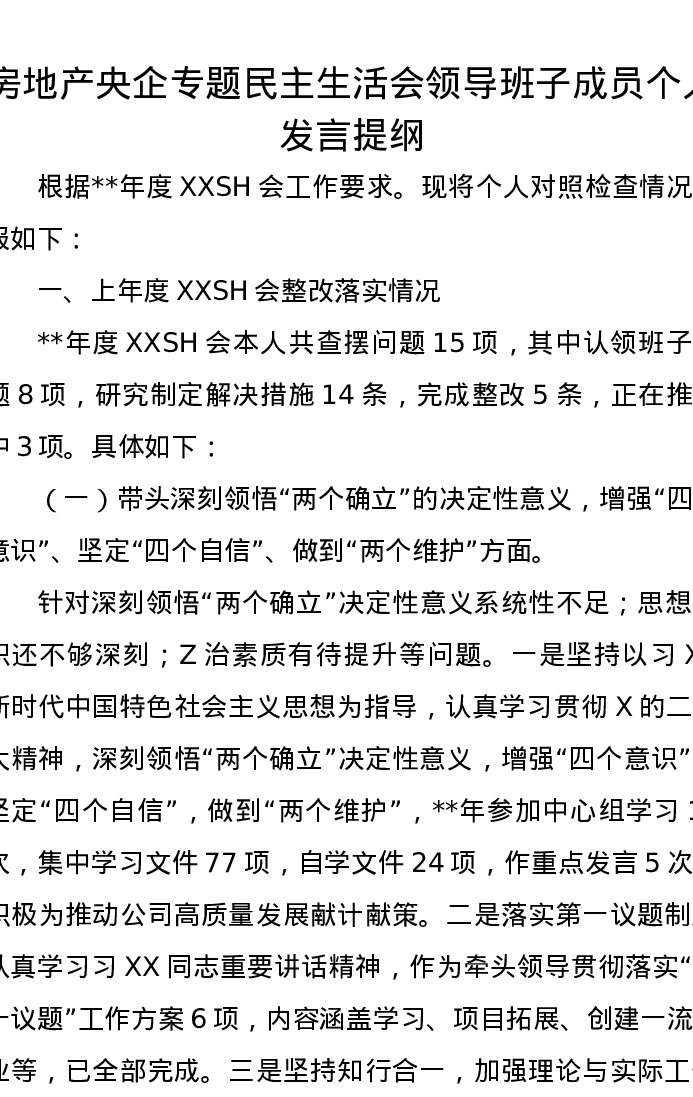 房地产央企专题民主生活会领导班子成员个人发言提纲