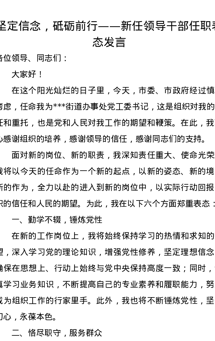坚定信念,砥砺前行——新任领导干部任职表态发言