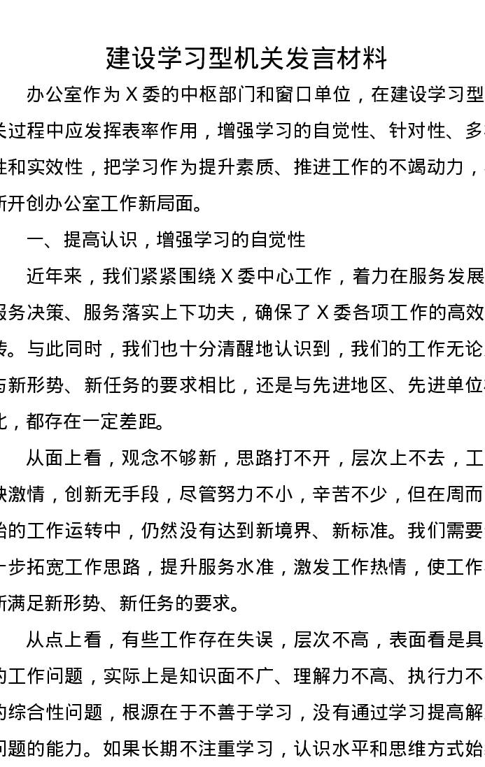 建设学习型机关发言材料