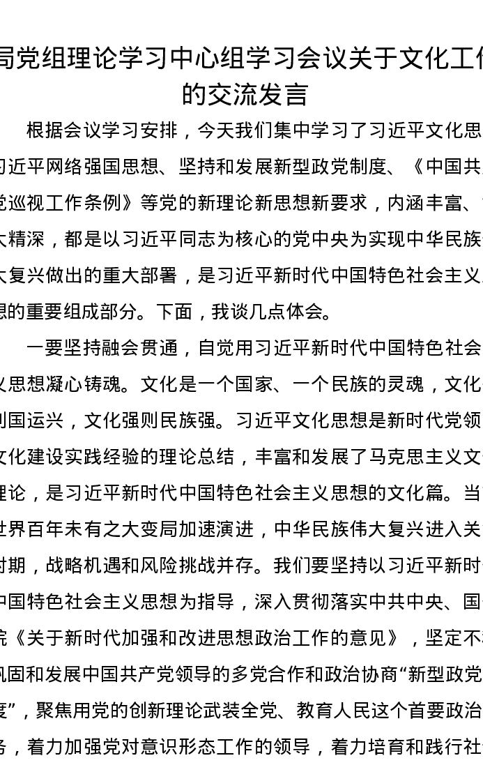 局党组理论学习中心组学习会议关于文化工作的交流发言