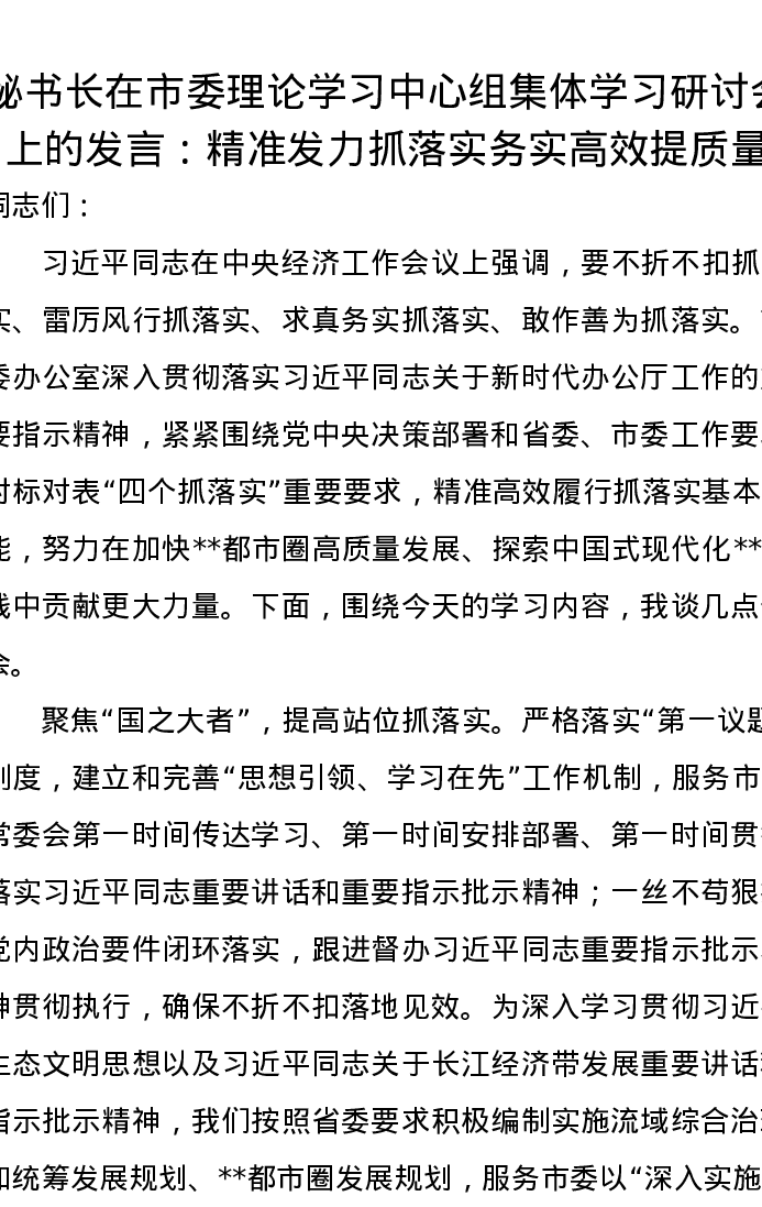 秘书长在市委理论学习中心组集体学习研讨会上的发言:精准发力抓落实务实高效提质量