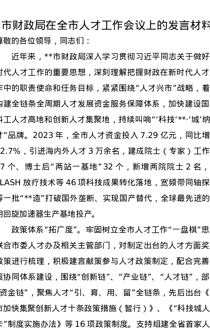 市财政局在全市人才工作会议上的发言材料