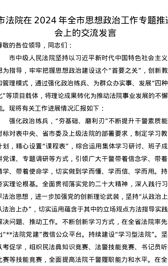 市法院在2024年全市思想政治工作专题推进会上的交流发言