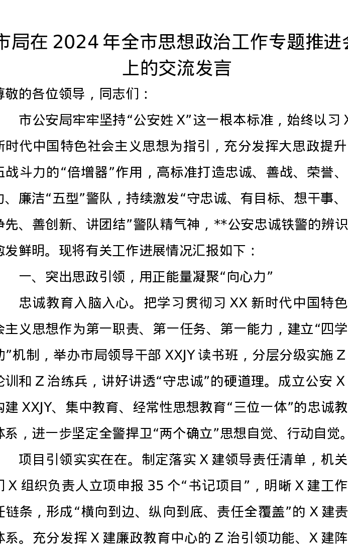 市局在2024年全市思想政治工作专题推进会上的交流发言