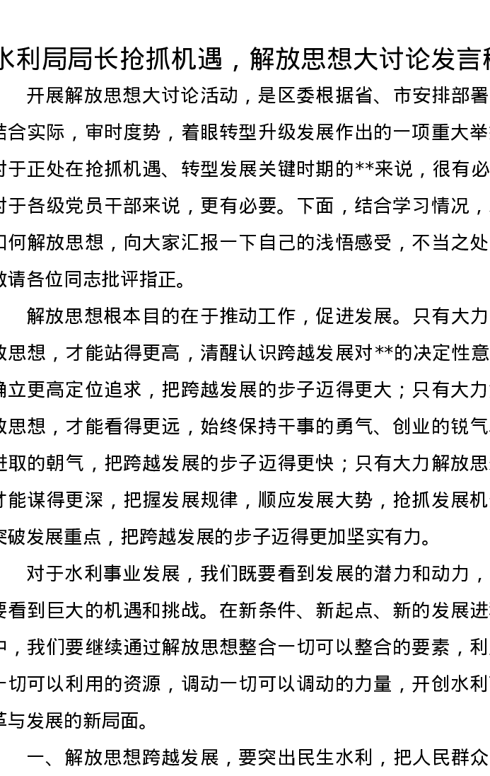 水利局局长抢抓机遇,解放思想大讨论发言稿